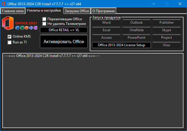 Office 2013-2021 Install Программа предназначена для онлайн-установки и активации офисных пакетов Office 2013 и 2016, распространяемых по технологии «кликни-и-работай» (C2R). Также имеется возможность создать собственный автономный дистрибутив Office для последующей установки в офлайн-режиме.