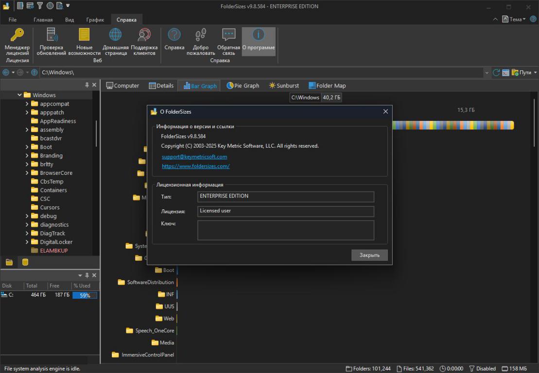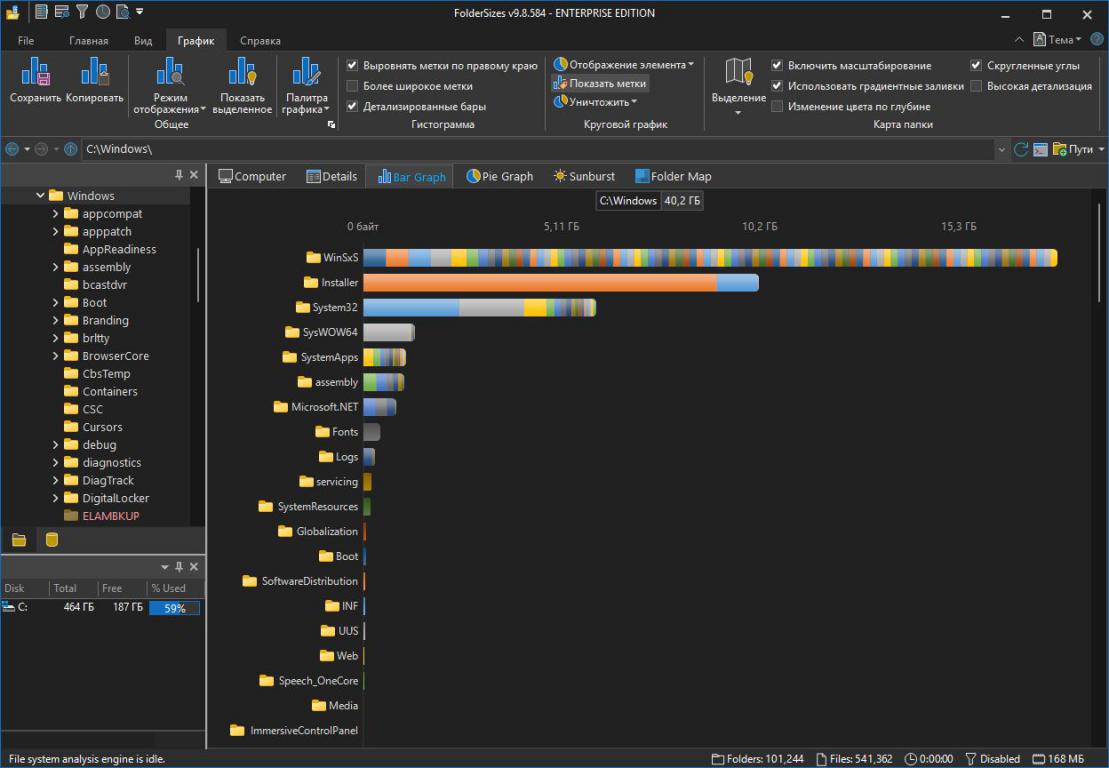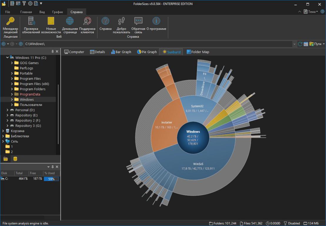 FolderSizes — это удобная и функциональная программа для анализа дискового пространства, которая позволяет определить, какие папки и файлы занимают больше всего места на жестком диске. Программа предоставляет подробную статистику по каждому разделу диска, отображает размеры папок и файлов, а также использует наглядные диаграммы и графики для визуального анализа. С помощью FolderSizes можно быстро обнаружить крупные или ненужные файлы, удаление которых освободит место на диске без вреда для системы.