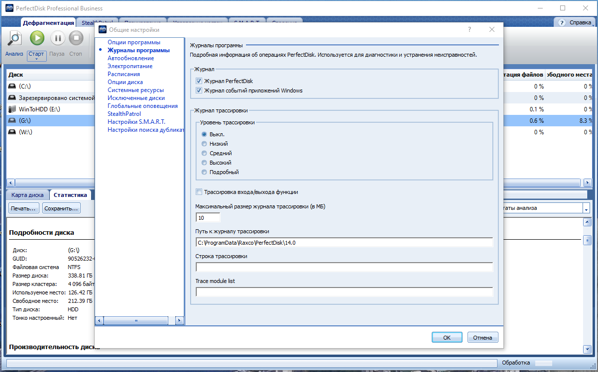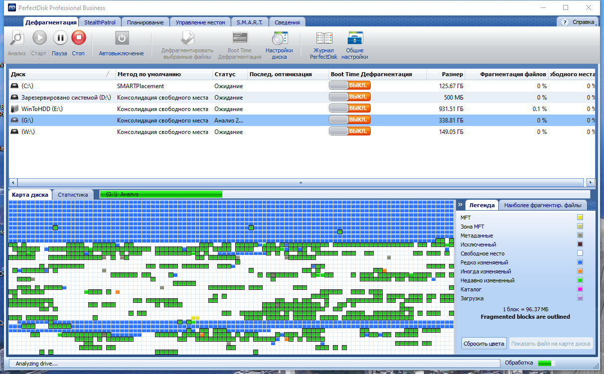 Данные в этой таблице представлены в виде разноцветных квадратиков, причём расшифровку цветовой кодировки можно посмотреть в главном окне PerfectDisk. Следует отметить довольно высокую скорость работы утилиты, что достигается благодаря использованию однопроходного метода дефрагментации с учётом данных S.M.A.R.T. жёсткого диска. Программа способна дефрагментировать не только локальные, но и сетевые диски. В последнем случае для упрощения настройки заданий используются профили сетевого планирования дефрагментации и полностью настраиваемое протоколирование процесса. Поддерживается работа с RAID-массивами.