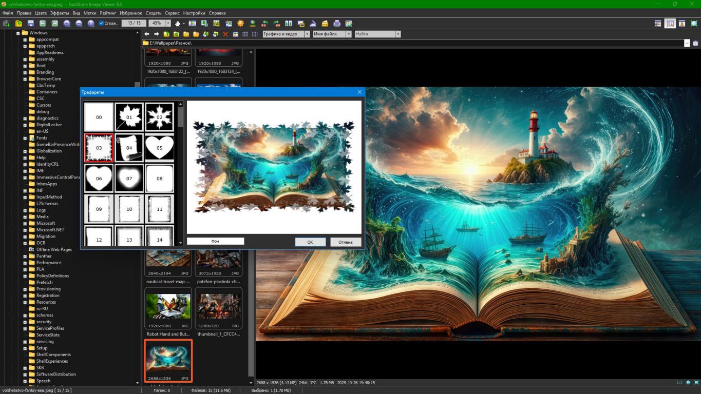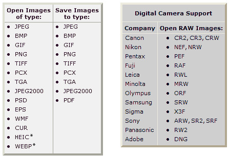 Широкая поддержка множества популярных форматов изображений, включая все основные растровые форматы, а также RAW-файлы с различных фотокамер. Важное примечание: поддержка форматов HEIC и WEBP осуществляется через кодеки Windows Imaging Component (WIC), встроенные в операционные системы Windows 10 и 11.