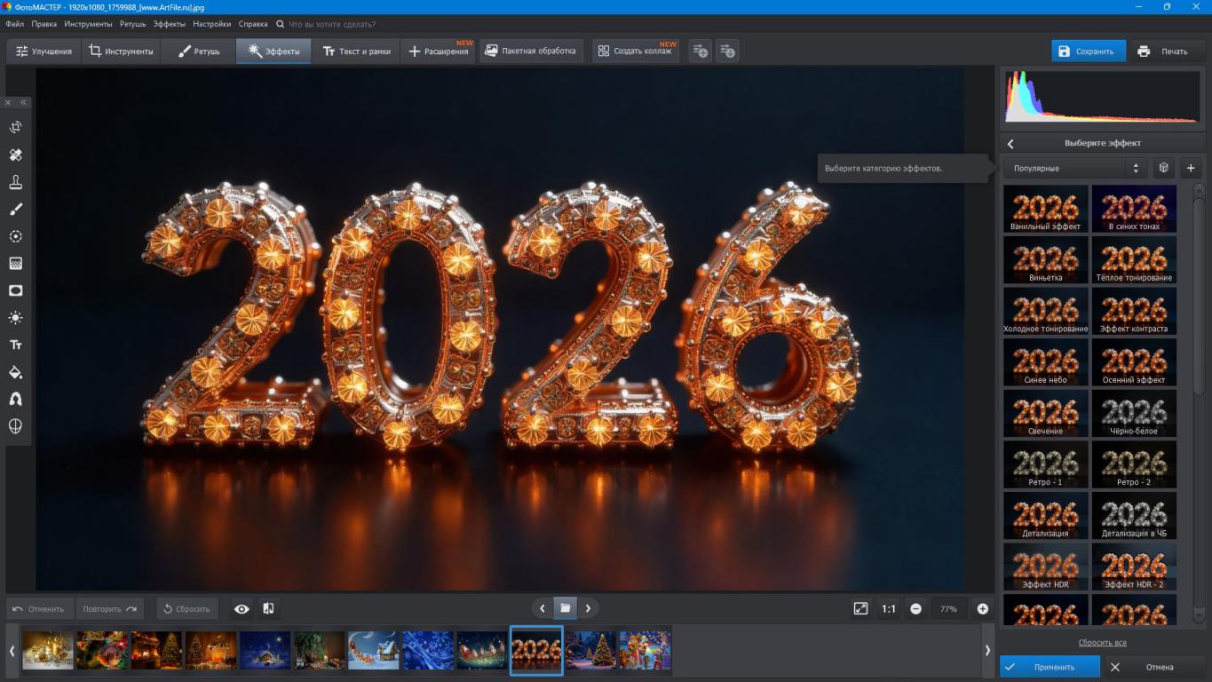 Обширная галерея удивительных эффектов В программу встроены десятки инновационных и уникальных фильтров для обработки фотографий на любой вкус: эффекты изысканного тонирования, повышения контраста и детализации, художественного виньетирования, классической черно-белой фотографии, впечатляющий HDR-эффект, стильное ретро и многие другие. Применяемые эффекты добавят вашей фотографии неповторимой индивидуальности и шарма. Всего один клик, и ваш снимок будет выглядеть так, словно над ним работал профессиональный дизайнер. Преображайте свои фотографии буквально за считанные секунды вместе с простой, но невероятно мощной программой для обработки — ФотоМАСТЕР!