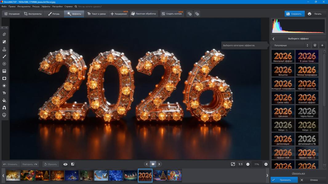 Обширная коллекция эффектных фильтров В программе представлена богатая галерея фильтров: художественное тонирование, усиление контраста, повышение детализации, виньетирование, стильные чёрно-белые вариации, выразительный HDR, эффекты ретро и многое другое. Каждый применённый фильтр добавляет фотографии уникальность и индивидуальность. Всего один клик — и изображение выглядит так, словно прошло профессиональную обработку в дорогой студии. Создавайте эффектные снимки за считанные секунды вместе с ФотоМАСТЕР.