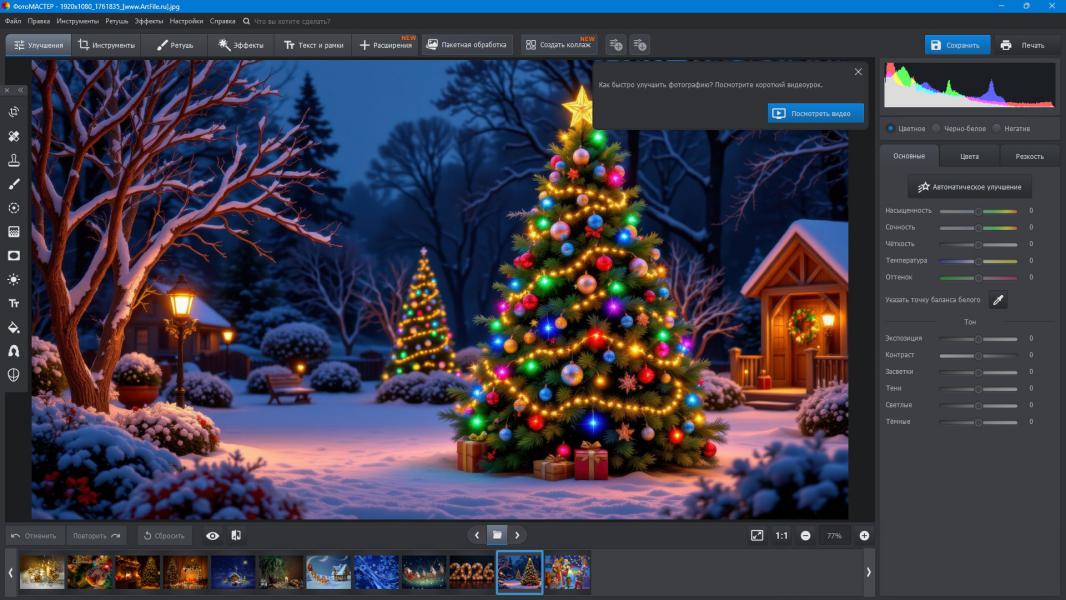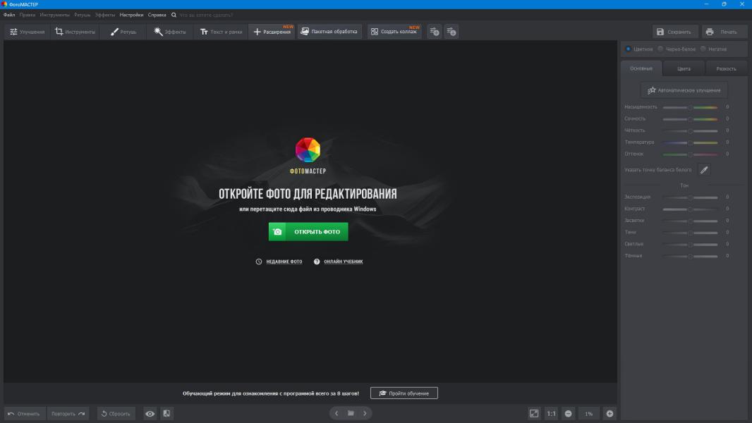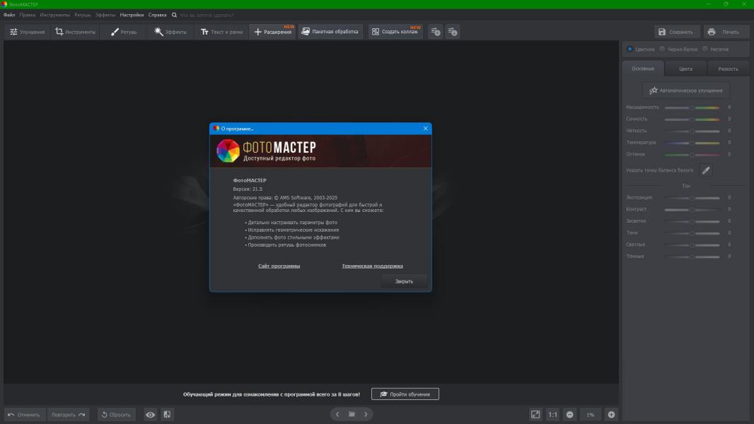ФотоМАСТЕР — это современное и многофункциональное программное решение, предназначенное для детальной обработки и профессионального улучшения цифровых изображений. Приложение разработано с акцентом на высокую скорость работы и безусловное сохранение исходного качества фотографий. Благодаря тщательно продуманной архитектуре редактирования, пользователь получает возможность свободно изменять любые параметры снимка и в любой момент отменять выполненные действия в произвольной последовательности, без какого-либо ухудшения итогового результата.