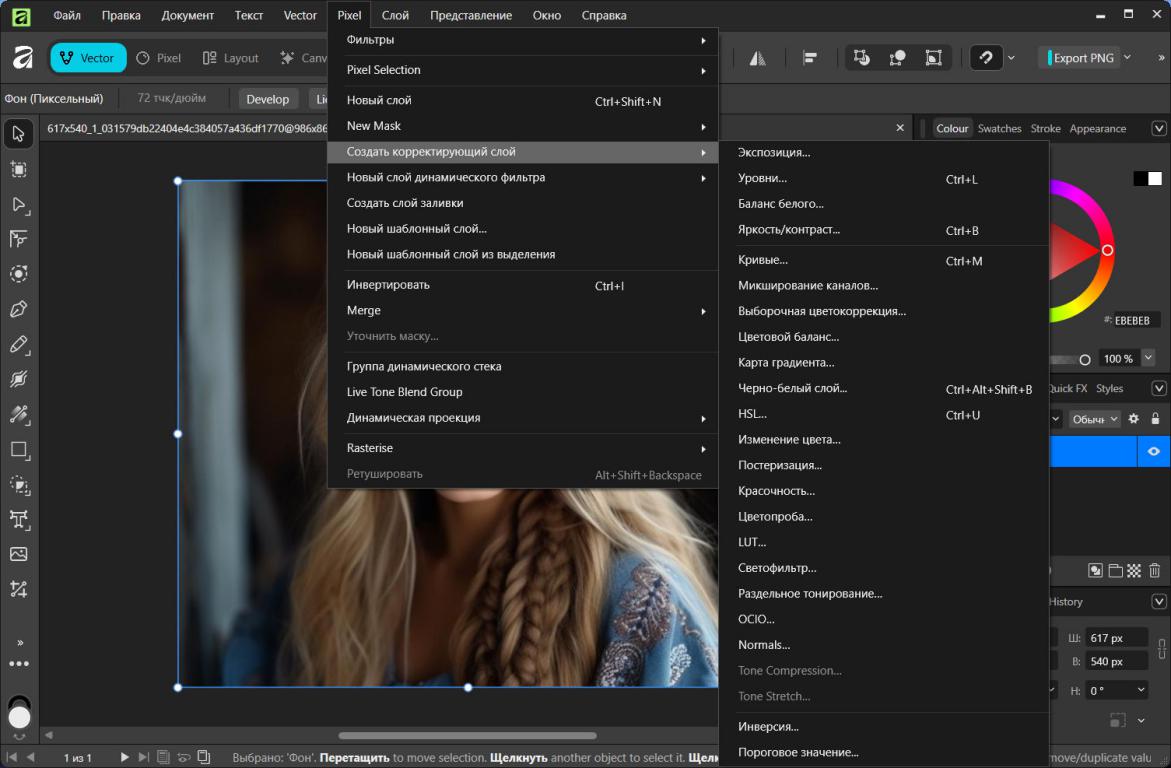 Affinity Canva поддерживает работу со слоями, масками и эффектами, что позволяет создавать сложные композиции и точно управлять каждым элементом проекта. Слои можно группировать, блокировать, скрывать, а также применять к ним различные режимы наложения. Это особенно удобно при работе с большими проектами, где используется много элементов: фоновые изображения, иконки, текстовые блоки, декоративные элементы и иллюстрации.