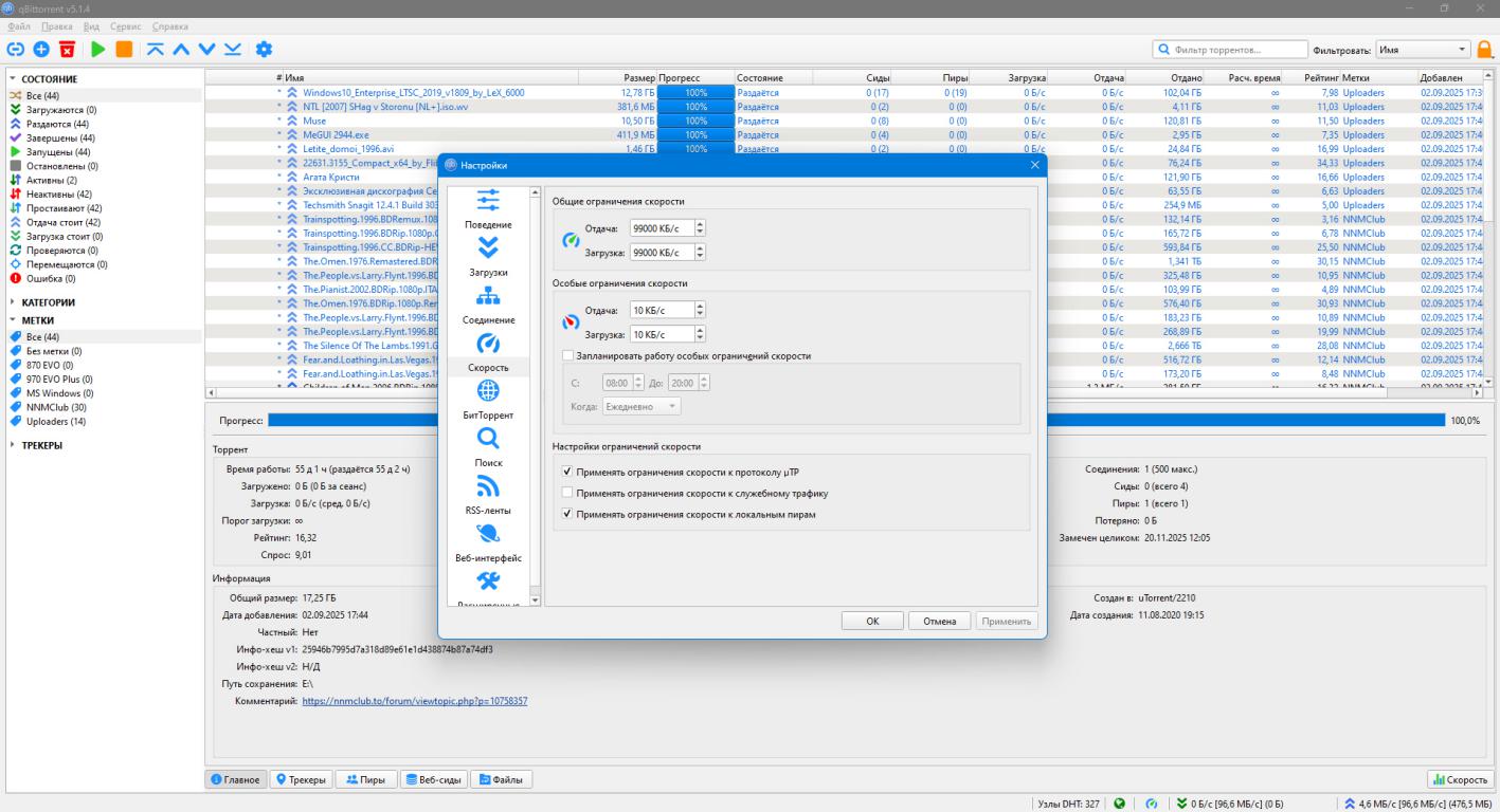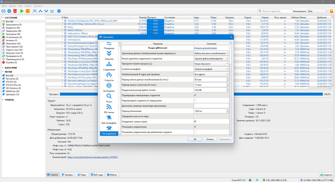 Расширенные возможности контроля над трекерами, пирами и торрентами с детальной информацией по каждому элементу.