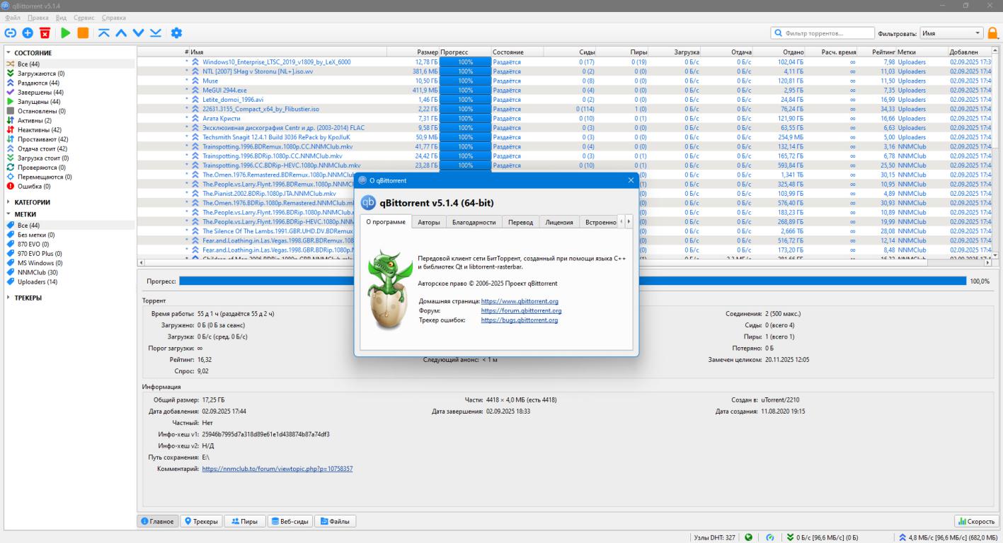 qbittorrent_5.1.4_x64_setup.exe — данная сборка программы использует библиотеку libtorrent версии 1.2.x в сочетании с фреймворком Qt6. qbittorrent_5.1.4_lt20_qt6_x64_setup.exe — эта версия предназначена для использования с библиотекой libtorrent версии 2.0.x и также базируется на Qt6.