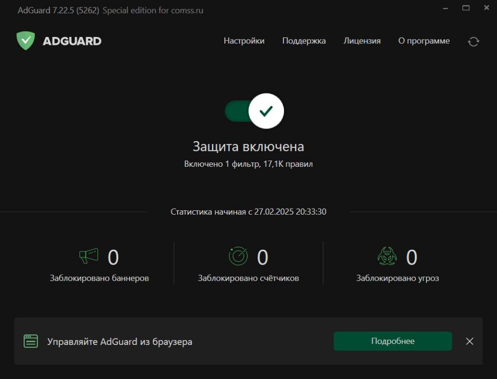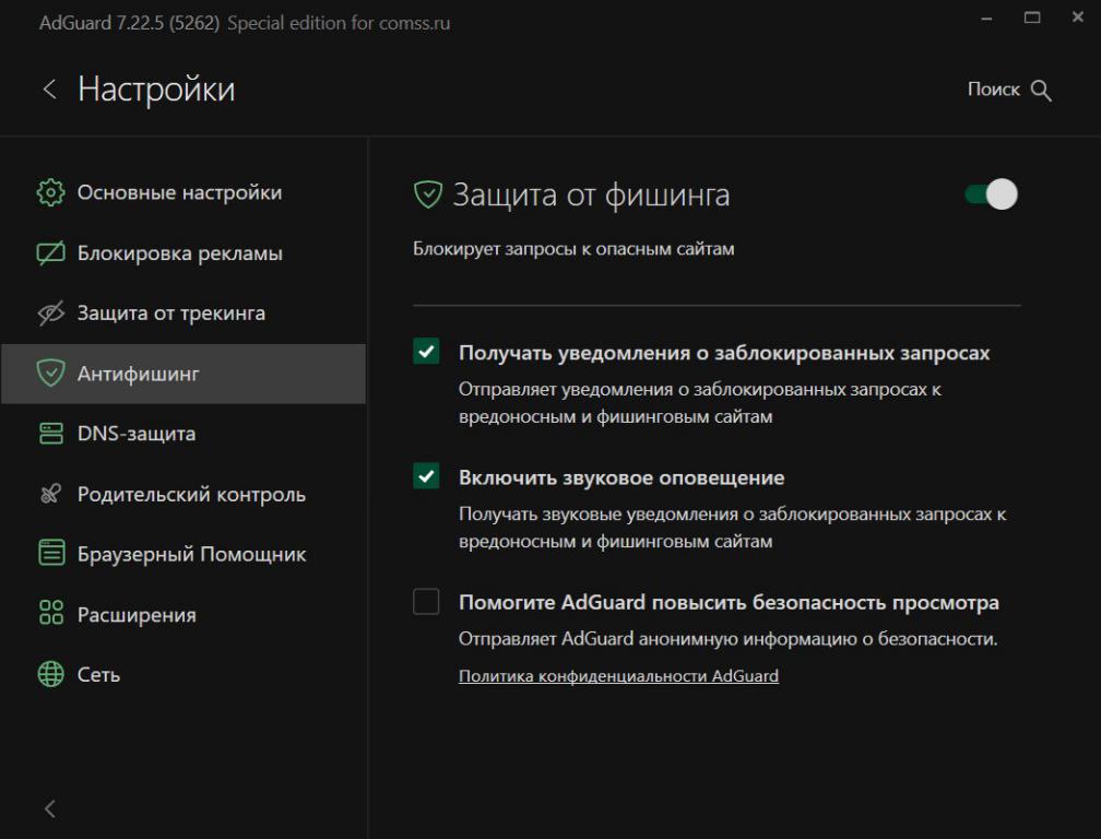 Adguard представляет собой мощный интернет-фильтр, предназначенный для обеспечения безопасности пользователей при работе в сети. Основные функции программы включают защиту от посещения опасных веб-сайтов, а также блокировку всех возможных видов интернет-рекламы. Приложение служит отличным дополнением к основному антивирусному программному обеспечению, предоставляя эффективную блокировку вредоносных, мошеннических и фишинговых ресурсов, а также реализуя функции родительского контроля за действиями детей в сети.