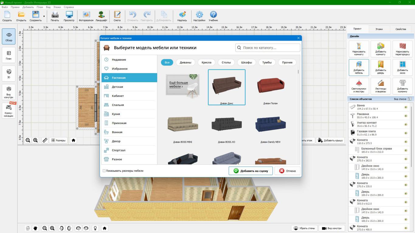 Трехмерное проектирование в режиме реального времени. Планируете определить место для новой кровати или только что приобретенного шкафа? Это не представляет никакой сложности! Указывайте нужные параметры мебели и оценивайте полученный результат. Приложение для создания трехмерных интерьеров демонстрирует все вносимые корректировки в объемном пространстве и в реальном времени. Вы получите возможность оперативно изменять расположение объектов, добавлять новые элементы, уточнять расстояния между ними. Объемную модель, при наличии такого желания, можно развернуть на весь экран, вращая трехмерную композицию под любым углом обзора!