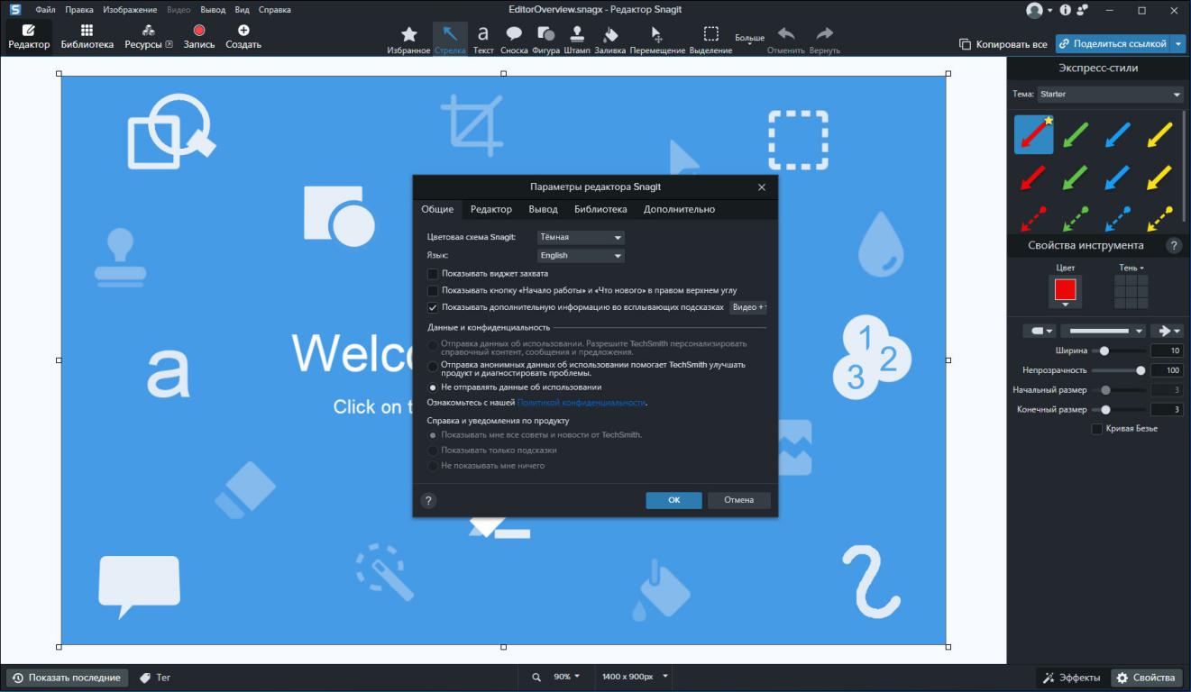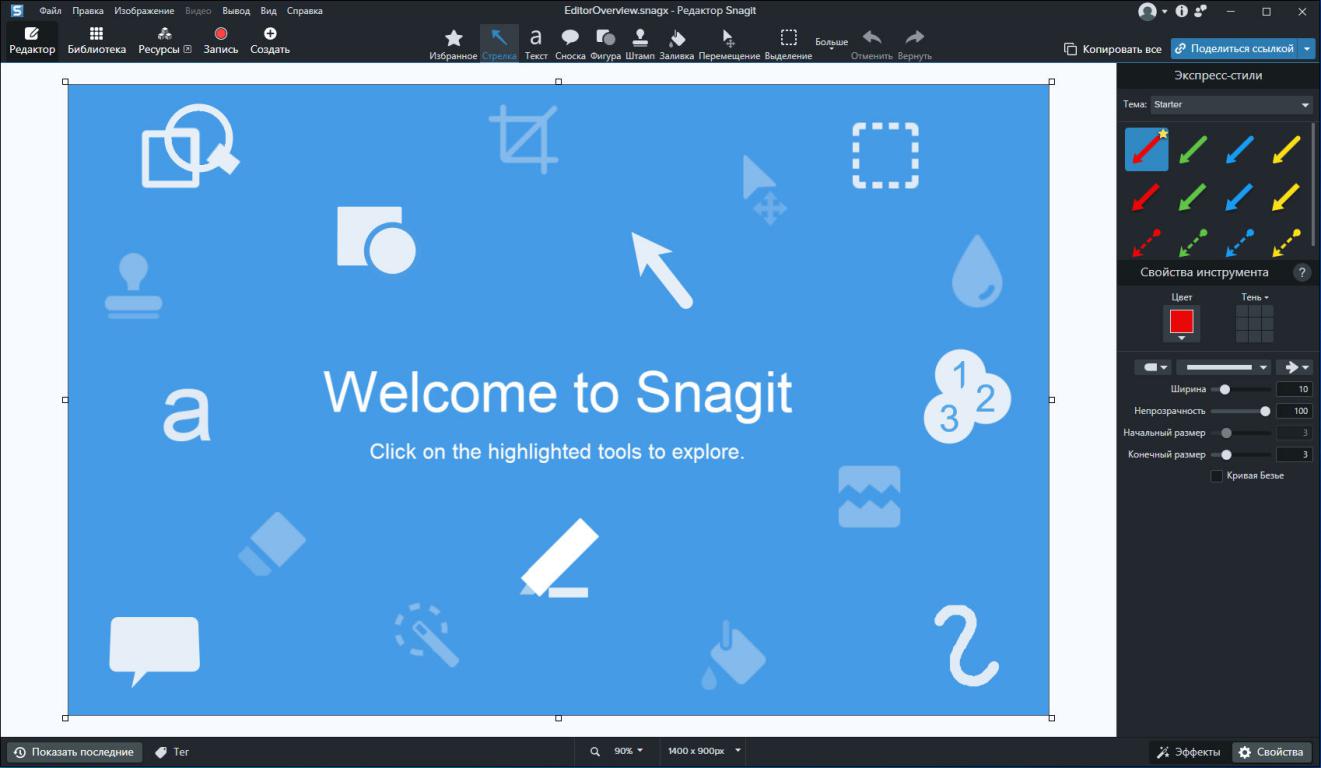Интегрированный векторный редактор Snagit Studio Добавление пояснений, комментариев, фигурных выносок и надписей, штампов, стрелок, значков, соединительных линий и прочих элементов осуществляется с помощью обширной библиотеки готовых векторных компонентов. Редактор содержит функции выравнивания, точного позиционирования, изменения размеров, поворота, заливки и других операций над векторными объектами.