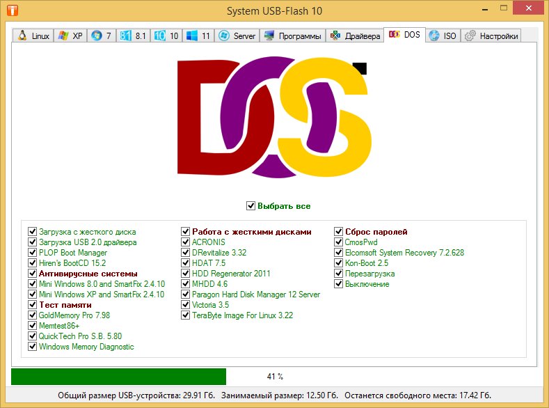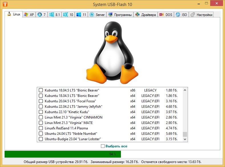 Выбирайте компоненты для записи строго по порядку — начиная с раздела Linux и заканчивая вкладкой НАСТРОЙКИ. После этого выберите целевой USB-носитель и нажмите кнопку Создать USB-версию. При желании можно включить функцию проверки контрольных сумм для выявления возможных ошибок записи.