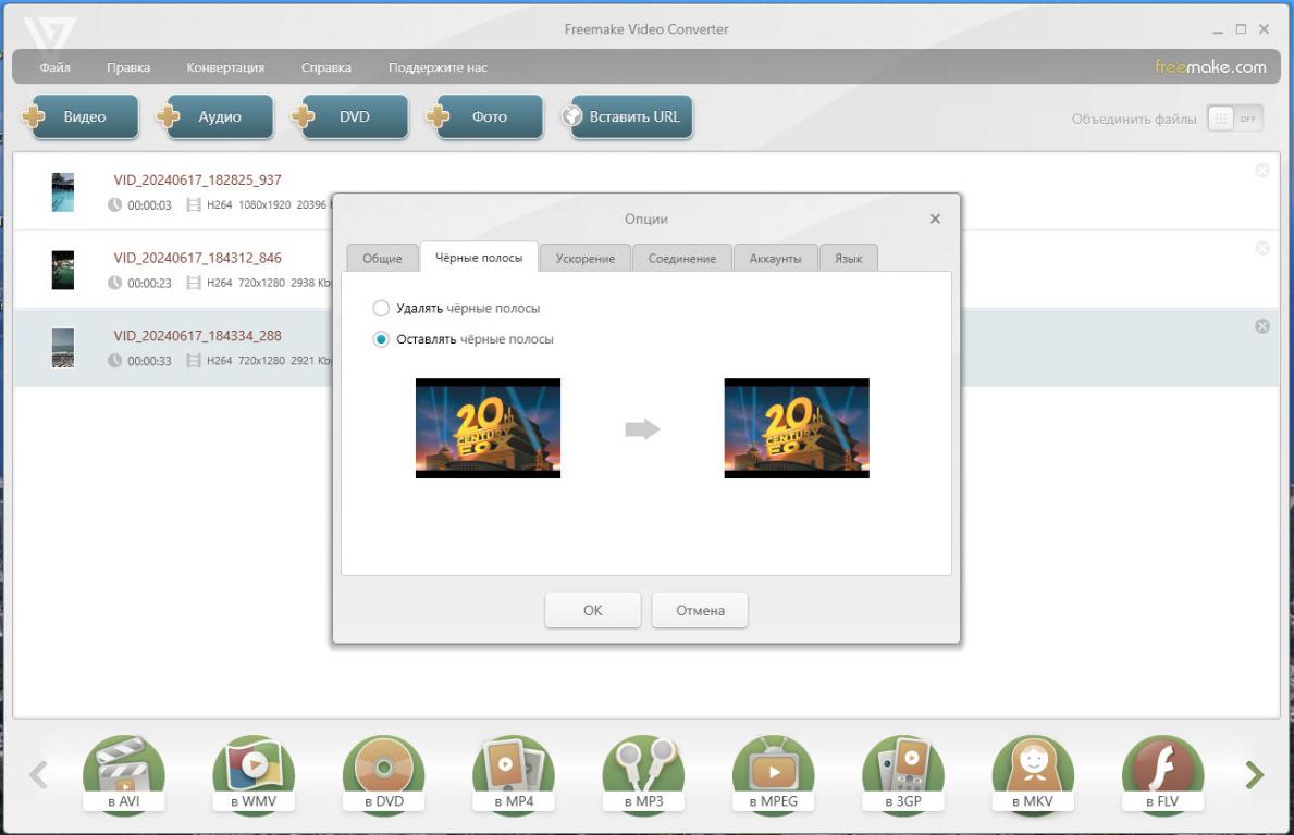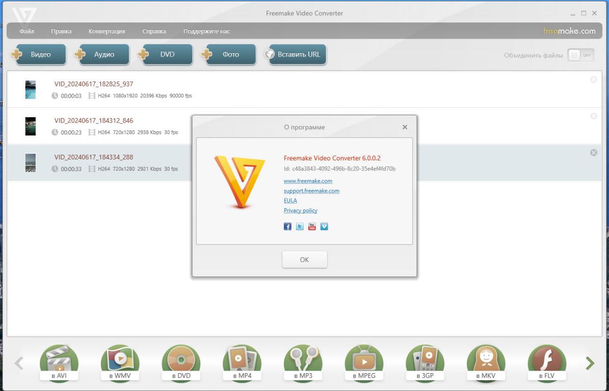 Конвертация более 500 форматов Freemake Video Converter обеспечивает преобразование видео в такие форматы, как MP4, AVI, MKV, WMV, MP3, DVD, 3GP, SWF, FLV, HD, MOV, RM, QT, Divx, Xvid, TS, Fraps и множество других. Реализована поддержка всех актуальных кодеков: H.264, MKV, MPEG4, AAC. Доступно создание видеофайлов из аудиоматериалов и фотографий, а также пакетная обработка множества файлов одновременно.