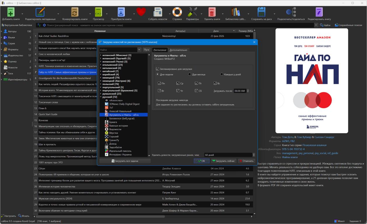 Загрузка новостных лент и преобразование их в формат электронной книги Calibre уже содержит в своей базе более трех сотен источников новостных лент. Ознакомившись с документацией, вы без труда сможете добавить и собственные источники для последующего преобразования новостей в формат электронной книги.