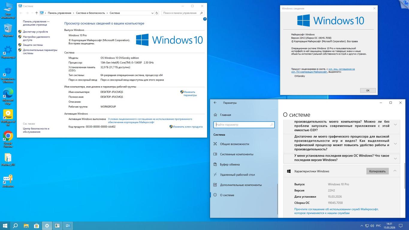 1. Базой для создания послужил официальный образ Microsoft WIN10 22H2 от октября 2022 года. 2. Интегрированы все системные обновления по 10 марта 2026 года включительно (актуально). 3. Добавлен браузер Google Chrome как альтернатива Microsoft Edge и устаревшему Internet Explorer. 4. Обновлен пакет автоматически устанавливаемых программ до более актуальных и соответствующих духу сборки версий. 5. Добавлены новые, проверенные на март 2026 года, рабочие версии активаторов. 6. В папку «Patches_FIX» на рабочем столе добавлены твики реестра для желающих вернуть некоторые отключенные функции в исходное состояние. 7. Расширен набор фоновых изображений и добавлены официальные темы оформления из магазина Microsoft. 8. Отключены: Защитник Windows, телеметрия (сбор диагностических данных), автоматическая загрузка рекламных игр, эффект размытия на экране входа, зарезервированное хранилище. Активирована «Защита системы» (создание точек восстановления) на начальном этапе. Для редакции Pro изменен режим обновления ОС с автоматического на ручной. 9. Файл образа системы install.wim подвергнут максимальному сжатию и очистке от «мусора» для уменьшения итогового размера дистрибутива. 10. В состав установочного образа включены утилиты для создания загрузочной флешки. 11. Отключена автоматическая загрузка и установка обновлений системы (для редакции Pro), поиск обновлений теперь выполняется вручную. 12. В контекстное меню рабочего стола добавлены пункты «Персонализация+» для доступа к классическим настройкам и «Панель настроек» для быстрого перехода к параметрам компьютера. 13. Отключены: Контроль учетных записей (UAC), SmartScreen, гибернация, «Новости и интересы», Spotlight. Проведена настройка конфиденциальности. Папка с активаторами и сами активаторы добавлены в исключения Защитника для беспрепятственной активации. 14. Удалены все плиточные приложения, за исключением магазина, установщика приложений, калькулятора и необходимых кодеков. 15. Исправлены некоторые незначительные ошибки и недочеты предыдущих версий.