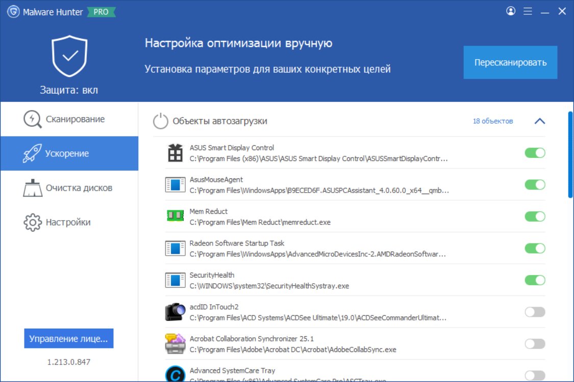 Инструмент для ускорения работы ПК позволяет выполнять оптимизацию списка программ, загружающихся автоматически при старте системы, анализ и корректировку запланированных задач, а также управление системными службами и приложениями.