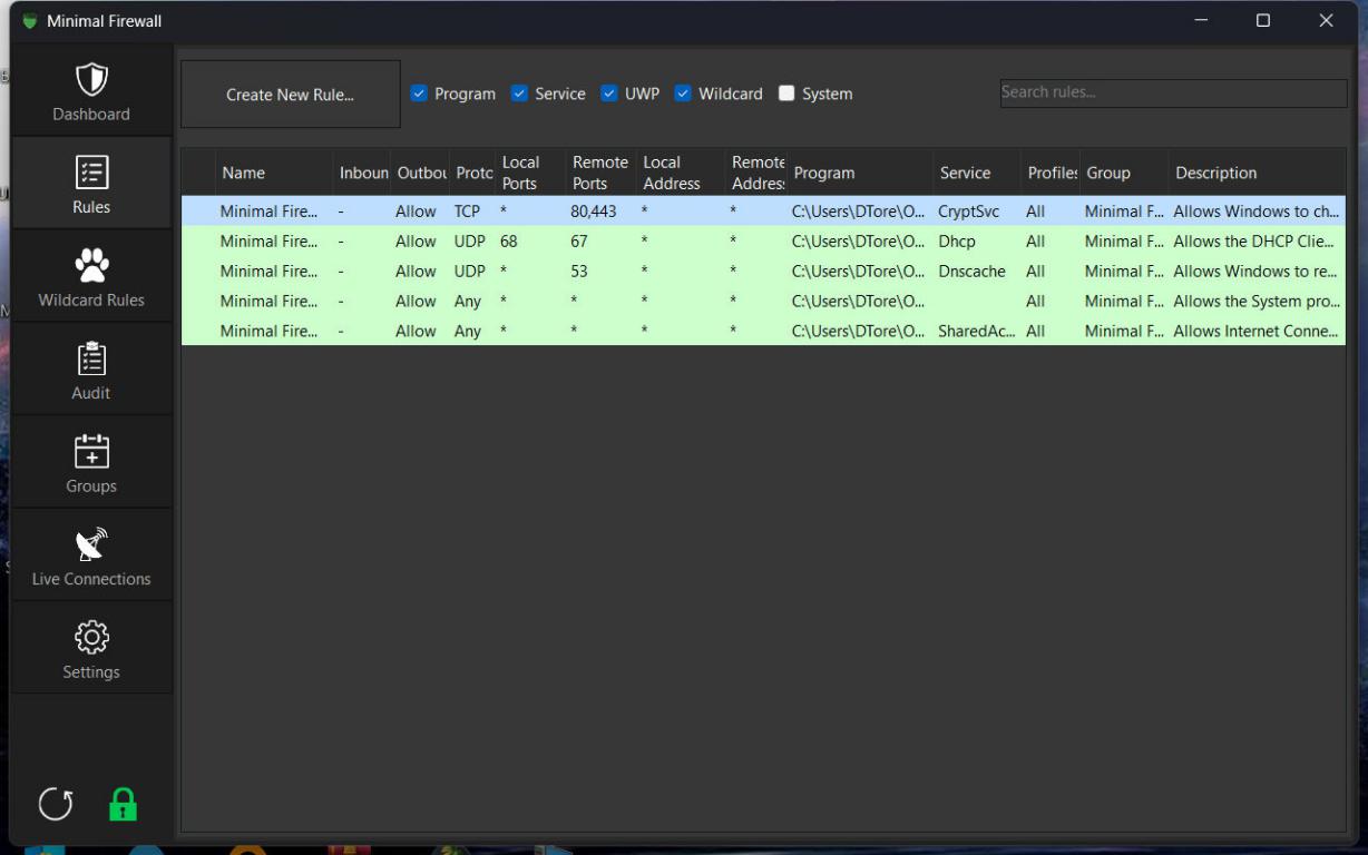 В отличие от подавляющего большинства альтернативных брандмауэров, Minimal Firewall функционирует как интерфейсный слой, предотвращая расширение векторов атак на ваш компьютер путем манипуляций с низкоуровневыми компонентами WFP. Приложение также оснащено функцией аудита для контроля новых правил, добавляемых в брандмауэр Windows. При использовании приложений WFP они действуют как фильтры поверх стандартного брандмауэра Windows. Проблема заключается в том, что Microsoft устанавливает различные уровни приоритета для своих правил брандмауэра (например, правила, измененные через редактор групповой политики или связанные с Защитником Windows, могут обладать более высоким приоритетом). В результате при возникновении конфликта между фильтром и правилами брандмауэра Windows остается неясным, какой из элементов имеет преимущество. Minimal Firewall обходит эту проблему, взаимодействуя напрямую с брандмауэром Windows, не отключая этот критически важный компонент безопасности операционной системы.