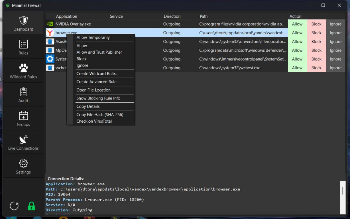 Портативность и автономность: Minimal Firewall представляет собой единственный исполняемый файл, не требующий установки. Все правила интегрируются непосредственно в брандмауэр Windows, поэтому отсутствует необходимость в установке дополнительных драйверов или фоновых служб.