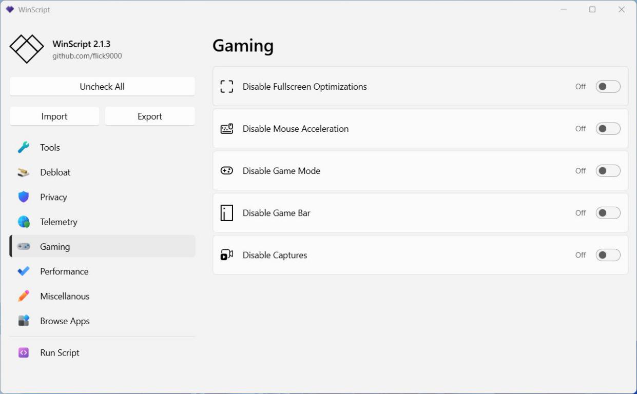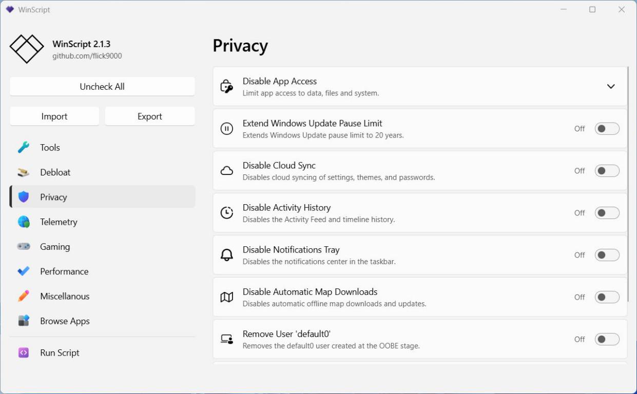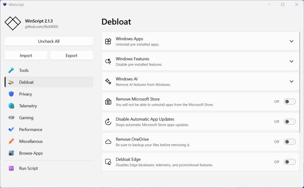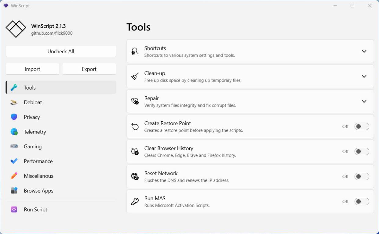 WinScript — это мощный и интуитивно понятный инструмент с открытым исходным кодом, разработанный для оптимизации и персонализации работы операционной системы Windows. Программа сочетает легкость использования с продвинутыми функциями, позволяя очищать систему от лишнего ПО, повышать уровень конфиденциальности, улучшать производительность и ускорять установку нужных приложений.