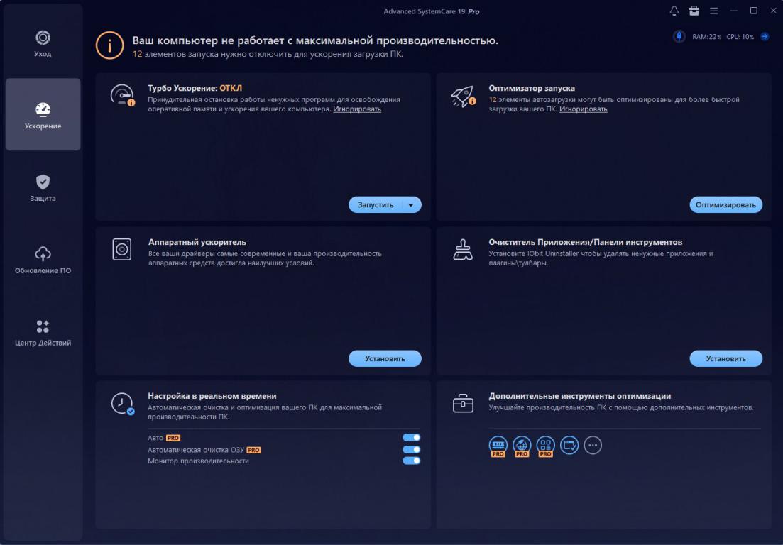 Рекомендована множеством пользователей. Программа Advanced SystemCare Pro сочетает унаследованную от предыдущих версий лёгкость использования с ещё более мощными возможностями. Один щелчок запускает сканирование и устранение десятков различных проблем на компьютере, а также активирует защиту машины от множества скрытых угроз безопасности.