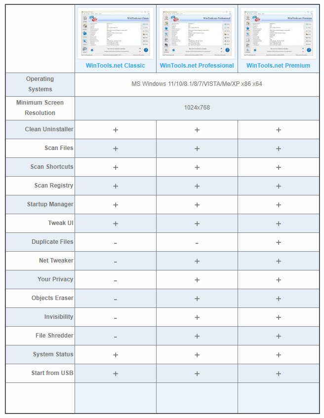 WinTools.net представляет собой набор специализированных инструментов, предназначенных для всесторонней оптимизации операционной системы Windows. В состав программного комплекса входят компоненты для полного удаления нежелательных программ и «мёртвых» ссылок в системном реестре, а также для контроля запущенных процессов, тонкой настройки системы, интернет-соединений и пользовательского интерфейса. Кроме того, имеются утилиты, обеспечивающие надёжное хранение конфиденциальной информации.